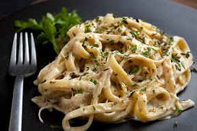 In a large skillet, saute garlic in butter, add crab and heavy cream and heat gently. Toss in cooked Fettuccine, grated cheese, parsley, freshly ground pepper.