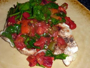 In a large sauce pan over medium high heat, saute onions and garlic for 1 minute. Add lime juice, green chilis, tomatoes, fire roasted peppers, seasonings and cook for about 5 minutes. Add spinach and cook until just wilted. Serve over chicken.