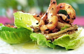 Classic Caesar salad with BBQ chilli prawns