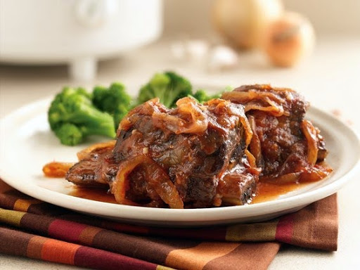 Spray 4- to 5-quart slow cooker with cooking spray. Place onion in cooker. Top with ribs. Cover; cook on Low heat setting 8 hours.