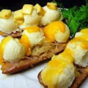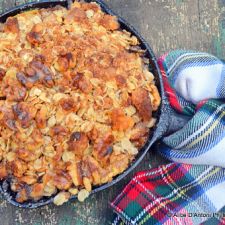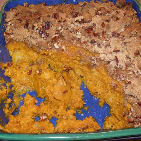 Preheat oven to 375. Lightly grease a 9" x 13" baking dish. In the oven on a cookie sheet, bake sweet potatoes whole until soft (approx. 45 min.) Remove skins,cut in half and quarter. With an electric mixer, mix sweet potatoes, crushed pineapple, sugar, butter, salt, and spices. Stir in one egg at a time. Pour into baking dish. Mix topping ingredients together and sprinkle over top of the casserole. Reduce heat in oven to 350.