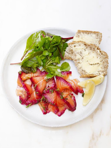 The next day, take the salmon out of the fridge and carefully unwrap it so you can rinse off the cure. Either use 100ml of cold water or gin. Hold the salmon over a baking tray and pour a splash at a time over your salmon. Use a spoon to gently push the beetroot cure off the fish. By now it should have shared its wonderful flavours with the fish and turned it a really vibrant colour. Put the rinsed salmon to one side and run the tray under the tap.