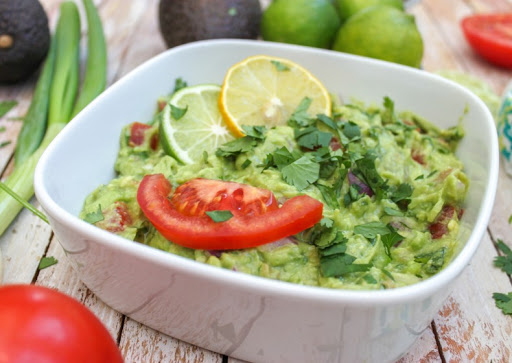Remove avocado flesh, place in bowl and mush with fork to desired consistency. Combine remaining ingredients and stir until well-combined.
