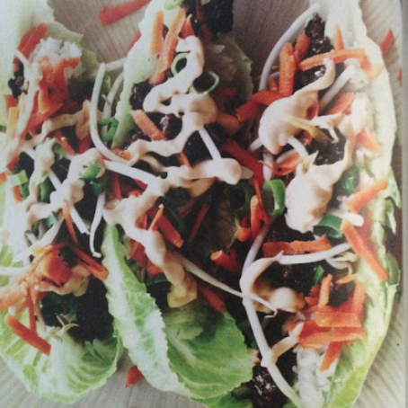To assemble, line a lettuce leaf with cooked rice and add a big spoonful of ground beef. Sprinkle on green onions, sprouts and carrots and then drizzle with spicy mayo on top.