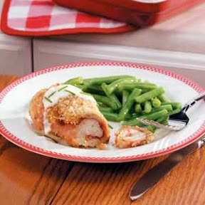 Flatten chicken breasts to 1/8-in. thickness; spread butter on the insides. Sprinkle with thyme. Top with a slice of ham and cheese; roll up tightly. Secure with toothpicks.