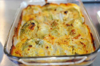 Slice cabbage into six to eight pie shaped slices. Remove hard inner core. Parboil slices until nearly done but still slightly firm. Drain very well, then arrange in a buttered 9 x 13-inch dish.