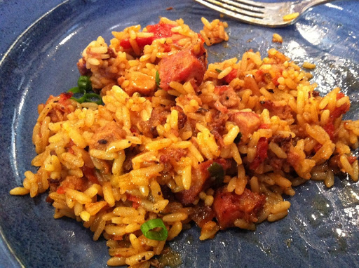 Increase the heat to high and add the chicken broth and tomato sauce, then the pork and green onions. Stir well and bring to a boil. Cover, reduce the heat to low, and simmer for 18 minutes. Remember, the pork and sausage are already cooked, you’re only making the rice at this point. Remove the post from the heat and it’s ready to serve! Season with salt and Tabasco.
