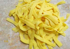 Roll out as thin as possible, less than 1/16-inch onto a flour starched surface; flip dough and roll some more; flip over again as necessary. (If you're using a pasta roller, add starch each time you pass it through it the roller. Then set it a notch thinner for the final run-through. If it sticks, add additional gum to the dough.)
