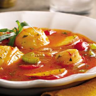 Tomatoes, tarragon and white wine make a fragrant broth for the scallops in this vibrantly colored easy one-pot stew. Make it a meal: Serve with a simple green salad and sop up the leftover broth with toasted whole-grain baguette.