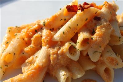 Cook pasta in salted water. Reserve 2 cups of pasta water, drain, rinse and set aside.