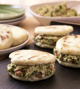- Arepas define Venezuelan cooking. These thick cornmeal patties are griddled, then baked, and then stuffed while warm with anything from white cheese to this zesty chicken salad with avocado mayonnaise.