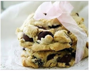 **Cream shortening and sugars. Add in vanilla and eggs. Cream thoroughly. Add in flour, baking soda, and salt. Combine and at this point, I add in about 2 Tbs. milk...just until the dough gets a bit gooey and sticks to the sides of the bowl. Throw in those chocolate chips...eat a few...give some to your helper...and then add some raisins! Ohhhh....all of you non-raisin lovers....they are like candy all warm and plump from the oven....we love them here...but you can ignore them if you choose.
