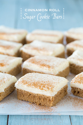 Preheat oven to 350 degrees. In a mixing bowl whisk together flour, cornstarch, cinnamon, baking powder, salt and powdered milk for 30 seconds, set aside. In the bowl of an electric stand mixer fitted with the paddle attachment, whip together butter, brown sugar and granulated sugar until pale and fluffy, scraping down sides and bottom of bowl occasionally. Add in eggs one at time mixing until combined after each addition. Blend in sour cream and vanilla. With mixer set on low speed, slowly add in dry ingredients and mix just until combined. Butter and 13 by 9-inch baking dish, then with buttered hands gently press and spread cookie dough into an even layer in dish. Bake in preheated oven until toothpick inserted into center comes out clean, 17 - 21 minutes. Allow to cool completely then frost with cream cheese frosting. Cut into squares and store in an airtight container.