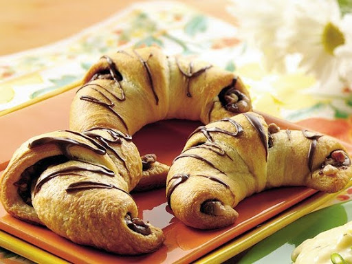 Heat oven to 375°F. Separate dough into 8 triangles; press each slightly to enlarge. Spread 1 tablespoon hazelnut spread evenly over each triangle. Sprinkle each with 1 tablespoon toffee bits and 1 tablespoon pecans; press in lightly.