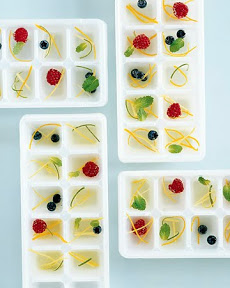 Drop combinations of fresh berries, mint leaves, ginger bits, and strips of citrus zest into empty ice cube trays. Add water to trays, and freeze.