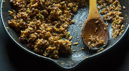 3. Deglaze the pan using the beer. Use a wooden spoon to scrape up all the flavorful dark bits. Return the beef to the skillet along with the chicken stock, cumin, black pepper, paprika and cayenne and cook until the liquid has reduced by half, about 10 minutes. Fold in the cooked white rice and the butter and cook briefly until hot. Sprinkle with scallions, if using. Serve.