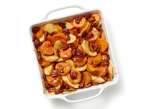 Butter the bottom and sides of an 8-inch-square baking dish. Remove the peel from the sweet potatoes and cut crosswise into 1/2-inch-thick slices. Arrange the sweet potato and apple slices in the prepared pan, alternating. Pour the whiskey-pecan mixture over the top. Cover with aluminum foil and bake 15 minutes. Remove the foil and baste the top with the whiskey sauce that's collected in the bottom of the pan; continue baking until the apples are soft and glazed, about 18 more minutes.