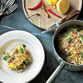 Add the chile and lemon oil to the pan that the linguine was cooked in. Add the lemon juice and cook over medium heat until sizzling. Return the linguine to the pan and add the crab meat. Toss gently for 1 to 2 minutes to warm the crab through.