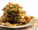 A little flour and egg bind together grated vegetables to make satisfying patties. We’ve topped them with a summery relish, but you could easily substitute salsa or sautéed mushrooms.