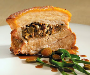 • BLACK OLIVE AND MUSHROOM-STUFFED PORK BELLY WITH CAPER BERRIES AND GARLIC CHIVES