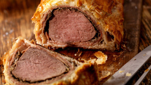 Roll out the pastry quite thinly to a size which will cover your beef. Unwrap the meat from the cling film. Egg wash the edge of the pastry and place the beef in the middle. Roll up the pastry, cut any excess off the ends and fold neatly to the 'underside'. Turnover and egg wash over the top. Chill again to let the pastry cool, approximately 5 minutes. Egg wash again before baking at 200c for 35 - 40 minutes. Rest 8 -10 minutes before slicing.