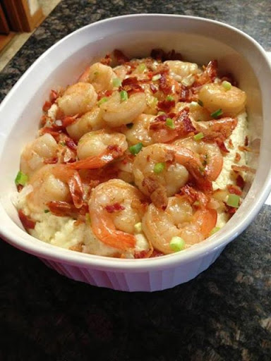 Put the water and cream in a saucepan and bring to a boil on medium high heat. Add grits and turn too low and cook for 25 minutes uncovered, stirring often. Add salt and pepper to grits, stir and then cover the cooked grits to keep warm. Next fry the three slices of bacon crisp, drain and crumble the bacon and set to the side. Add scallions and garlic to the frying pan and cook in the bacon fat on medium high for 3 to 4 minutes until garlic is translucent and scallions are tender. Add the shrimp to the pan and cook on medium high three or four minutes stirring often until shrimp is pink and firm. Place grits in a serving bowl and add shrimp mixture to the top. Sprinkle with the crumbled bacon and remaining scallions.