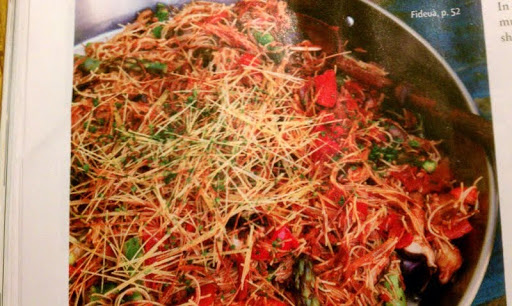 In Spain, special noodles are used to make this paella-like party dish, but angel hair pasta fragments work too. Break pasta strands 30 or so at a time to keep them from scattering. Broiling the dish is key to getting its crunchy texture. Serve with Quick Aioli.