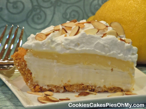 Pour mixture into pie shell or graham cracker crust. Pour reserved lemon pudding on top and chill at least 2 hours. Whip cream to stiff peaks thick, add powdered sugar to taste and vanilla. Spread whipped cream over top of pie. Garnish with toasted sliced almonds. Keep leftovers in refrigerator.