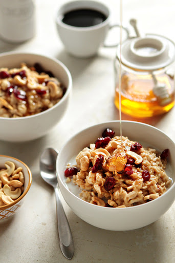 In a small serving bowl, stir cashew butter into hot cooked oatmeal until smooth. Drizzle with honey. Top with honey, dried cranberries, and cashews. If desired, add milk, cinnamon and brown sugar to taste.
