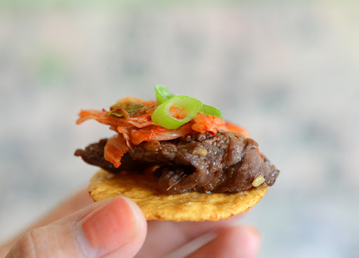 Assemble the appetizers: on each rice cracker, lay a piece of steak and 1 or 2 pieces of kimchi, then add scallions on top for garnish.