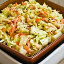 Remove outer leaves from cabbage, cut through center and remove corne then chop cabbage well. I like to cut the cabbage into thin slices, then turn cutting board the other way and coarsely chop. You can also use the food processor to buzz it a few times to get uneven sized small pieces. Grate carrot or chop into small pieces. In a bowl combine chopped cabbage and carrots.