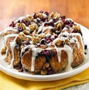6.Sprinkle reserved cranberry-walnut mixture over coffee cake. In medium bowl, stir glaze ingredients until smooth. Drizzle glaze over top of rolls. Serve warm.