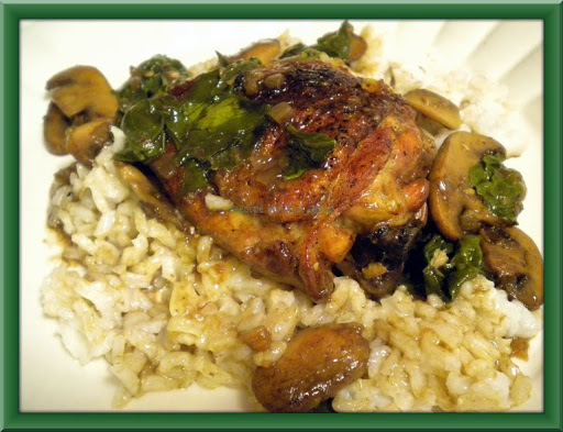 When the thighs have braised for about an hour, pull them out of the oven and remove the chicken thighs from the pan, setting them aside on a clean plate for later. Place the sautee pan back on your stove top over medium-high heat and allow the braising liquid to reduce until it becomes thick enough to coat the back of a spoon. When your sauce has reduced down to the proper consistency, add in a couple handfuls of fresh spinach and stir until it wilts. If your chicken has cooled off too much, add them back into the pan briefly to bring them back up to temperature. Finish the dish by placing two chicken thighs per person on a plate over freshly steamed rice. Spoon the spinach, mushroom and garlic sauce over the chicken.