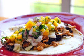 Begin with a flour tortilla, spread a thin layer of the black bean mash across the center of the tortilla. Top with chicken, then cabbage, then sour cream mixture, then mango cilantro relish. Top with more cilantro if desired. Roll up & enjoy!