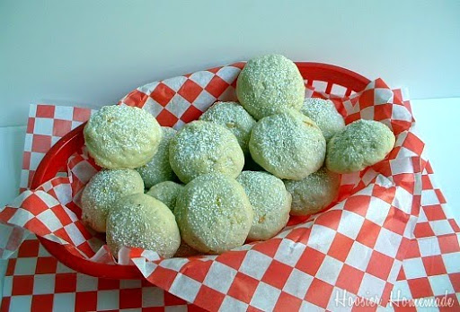 Shape dough into 1 inch balls. Place on greased or parchment paper lined cookie sheet. Bake for 12 – 15 minutes or until lightly golden. Remove from cookie sheets and let cool.