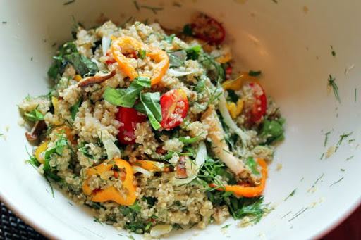 When quinoa is ready, tumble over the top of the layered veggies. Allow to sit for about 5 minutes. Then add: