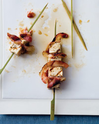 * Wrap each swordfish cube in 1/2 slice of pancetta and thread onto skewers (or soaked rosemary sprigs). Brush finished skewers with remaining marinade.