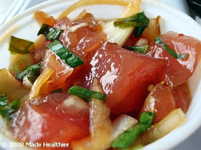 Season Ahi with Hawaiian salt, mix well. Combine all ingredients in a large bowl. Chill well and enjoy!