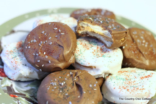 Melt almond bark or candy coating in the microwave according to the package directions. Spread peanut butter on one cracker and top with another cracker. Cover crackers in melted coating and set aside. Sprinkle with decoration if desired before set. Allow coating to set and enjoy!