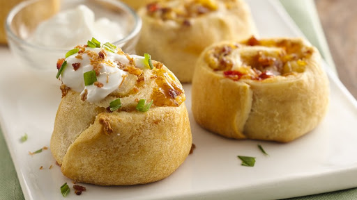 Bake 17 to 21 minutes or until golden brown. Immediately, remove from cookie sheets to serving plate. Top each pinwheel with sour cream, remaining bacon bits and the green onions. Serve warm.