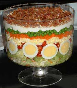 Place lettuce in a large bowl. Layer peas, bell pepper, tomatoes, celery and scallions on top. Whisk yogurt, mayonnaise, vinegar, sugar to taste, garlic powder, salt and pepper in a medium bowl until smooth. Spread dressing evenly over the top of the salad. Sprinkle with cheese, basil and bacon. Serve room temperature or chilled.