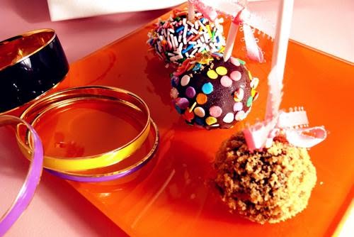 Quickly dip a frozen cheesecake pop in the melted chocolate, swirling quickly to coat it completely. Shake off any excess into the melted chocolate. If you like, you can now roll the pops quickly in optional decorations. You can also drizzle them with a contrasting color of melted chocolate (dark chocolate drizzled over milk chocolate or white chocolate over dark chocolate, etc.) Place the pop on a clean parchment paper-lined baking sheet to set. Repeat with remaining pops, melting more chocolate and shortening (or confectionary chocolate pieces) as needed.