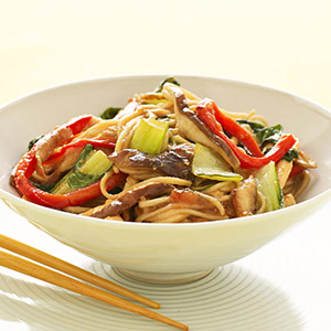 4. Add bok choy and red pepper strips to skillet. Cook 2 minutes. Return chicken to pan along with broth mixture. Cook 2 to 3 minutes, until thickened. Gently stir in soba noodles and serve.