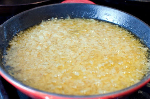 Combine the onions, oil, and a pinch of salt in a 8-9″ wide saucepan and place over medium heat. Bring the oil to a simmer and reduce the heat to low. (If you have a diffuser like a Flame-tamer, place this underneath the pan). The oil should only bubble gently, slowly cooking and caramelizing the onions. Stir as needed to maintain even cooking, scraping any stray bits of onion that may stick to the sides of the pan. The oil will become cloudy, but then clear as moisture evaporates. Cook about 2 1/2 hours, or until the onions are a rich, golden brown (a “shade darker than a golden raisin”) and the oil is clarified.