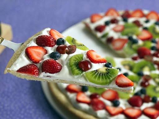 In chilled medium bowl, beat whipping cream with electric mixer on high speed until soft peaks form. Gently stir frosting into whipped cream. Spread over cookie pizza. Arrange fruit on top.