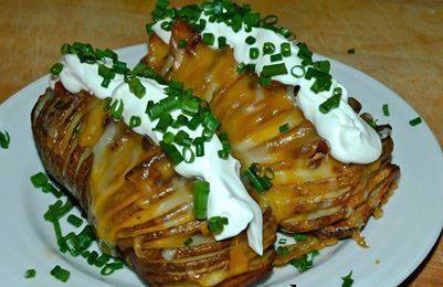 Using a wooden spoon as a cradle, place each potato in the spoon and make several parallel slits into each potato top making sure not to slice completely through.