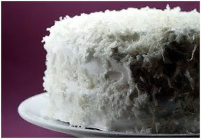 3. Without turning off mixer, pour the sugar syrup into the beaten egg whites in a thin, steady stream. Continue beating constantly, on medium-high speed, for about 5 minutes or until stiff peaks form but frosting is still creamy. Frost top and sides of cake immediately. Generously sprinkle top with shredded coconut.