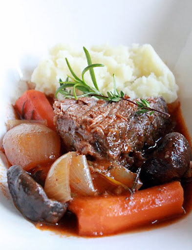 Heat a large pot and add the olive oil. Add a generous amount of salt and pepper to the entire chuck roast. Lightly coat the entire roast with the flour. The goal is to brown all sides of the roast, cooking a few minutes on each side, yes, each side, until nice and brown. Once browned, remove from the pot and either set aside, or place it in your slow cooker. Add the tomato paste, garlic, wine, and stock. Scrape the bottom of the pan, and bring to a boil, stirring often to break down the paste. If you are using a slow cooker, add the meat, pour over the stock, and toss in the vegetables, salt and pepper, bay leaves, and thyme. Cover, and cook on low for 8-10 hours.
