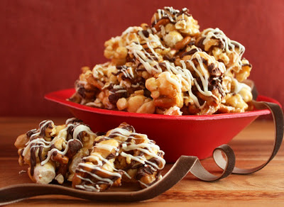 Pour melted chocolate into a piping bag or ziploc bag and cut the tip off and drizzle melted chocolate over popcorn.