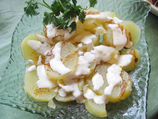 This was really easy, and tasty too! I added garlic and about 2x the lemon juice to mayo to make a sort of thinnish consistency to make the lemony/garlic white sauce. The red sauce was made with smoky Spanish paprika and chili powder. The combination of the two sauces was awesome. I seasoned the potatoes with salt and pepper and squeezed a little lemon juice overall. Going into the normal rotation.